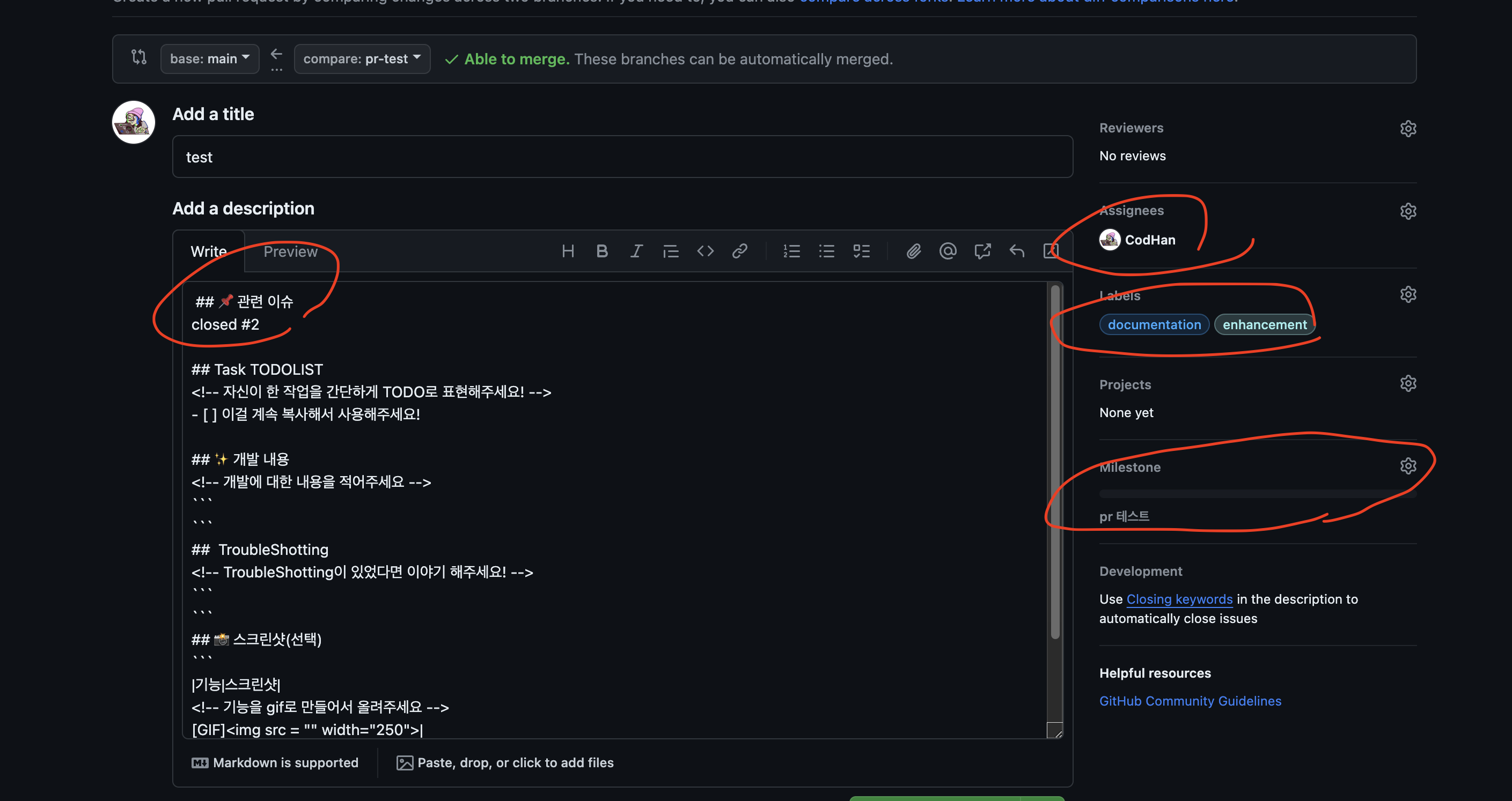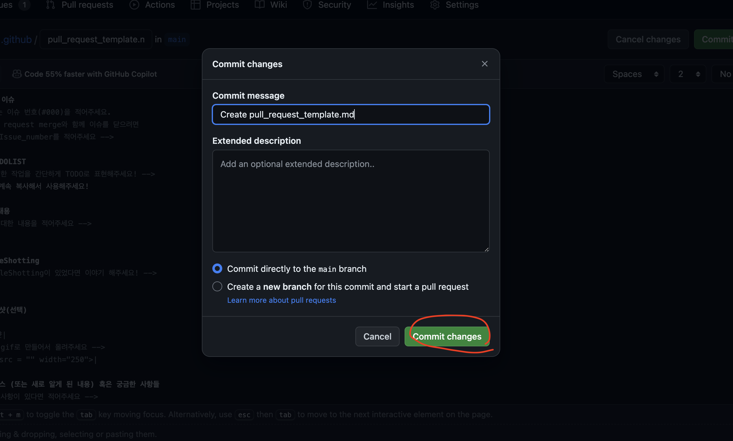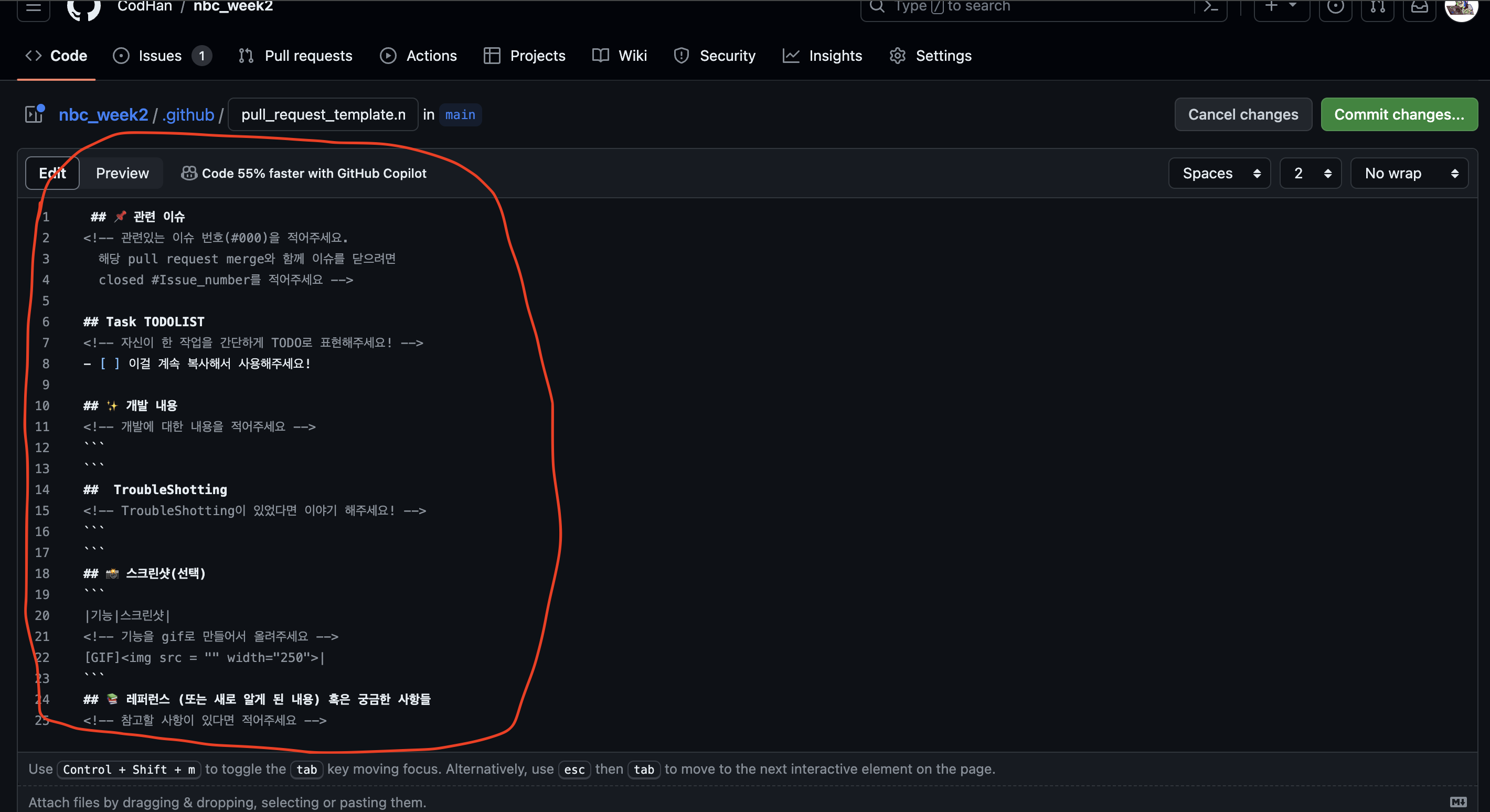 이슈를 생성했으면 제일 중요한 PR 탬플릿도 생성을 해야 한다. 이슈와 연결되는 부분이고 이슈의 내용을 복붙 한다고 생각하면 될 것 같다.